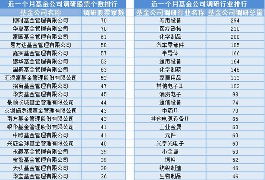 近一个月(5月4日-6月3日),博时基金参与公司调研的数量最多,共调研70家上市公司,然后调研较为活跃的还有华夏基金、富国基金和易方达基金,分别调研70家、61家、58家上市公司;从调研行业上来看,基金公司对专用设备行业的上市公司调研次数最多,共有294次,其次是医疗器械行业,基金公司调研了210次。