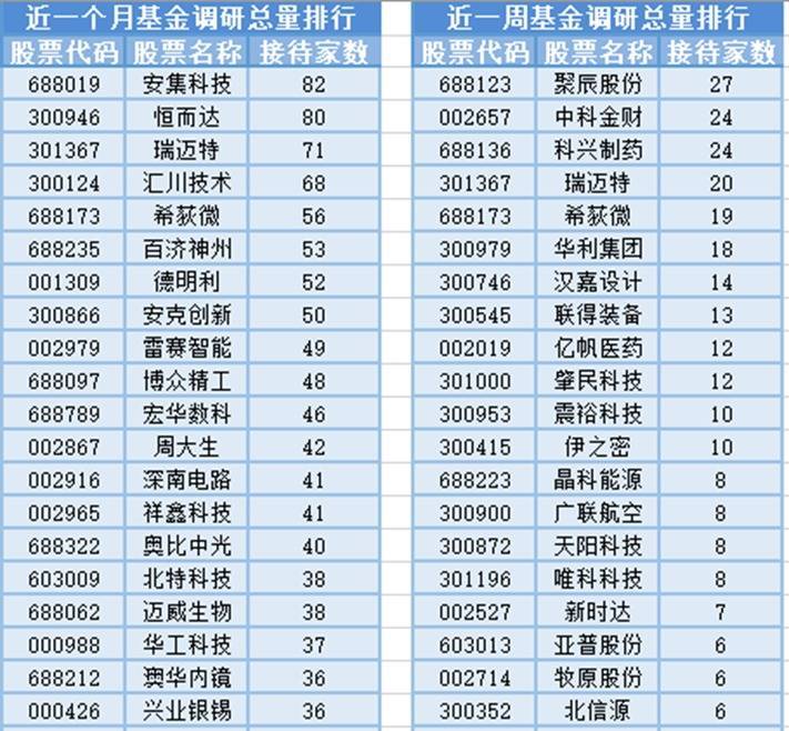 从个股调研情况上来看,最近1个月(5月4日-6月3日)最受公募基金关注的是安集科技,属于半导体材料行业,主营业务为关键半导体材料的研发和产业化,共有82家基金管理公司参与调研,其次是恒而达和瑞迈特,分别接受80家、71家基金管理公司的调研。