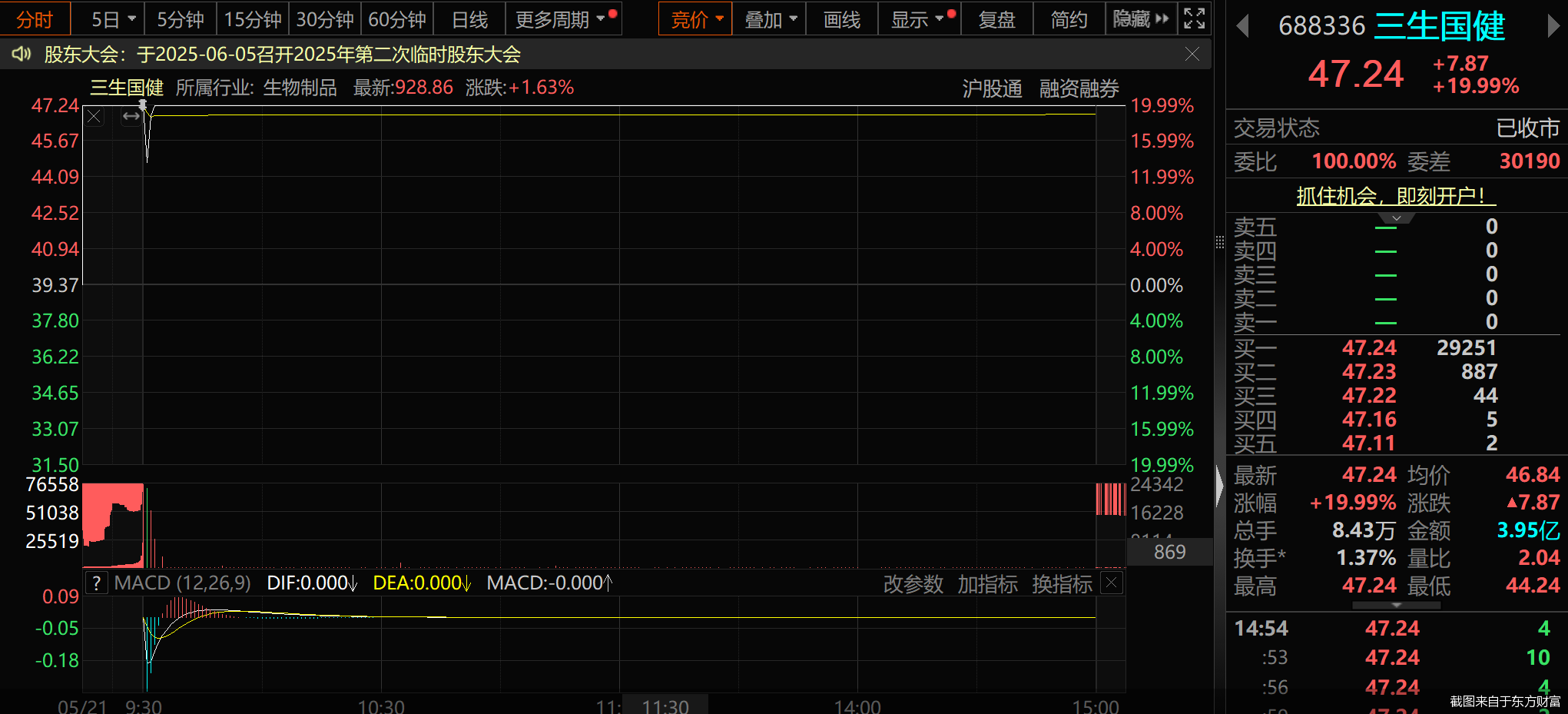 在这一消息披露前,三生国健已于5月19日冲上涨停。在这一消息披露后,三生国健更是连续两个交易日涨停收盘,斩获三连板。截至5月21日收盘,三生国健报47.24元/股,涨幅为19.99%。