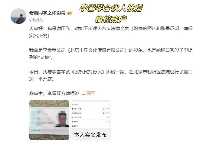 “公司注销两年,财务疑云未散。”6月17日深夜,一则实名举报在网络上迅速发酵:自称“前股东”的谢田飞,公开指控知名艺人李雪琴名下公司存在财务问题配资专业股票,声称自己多次索要相关明细无果,最终选择在社交平台发声,引发社会广泛关注